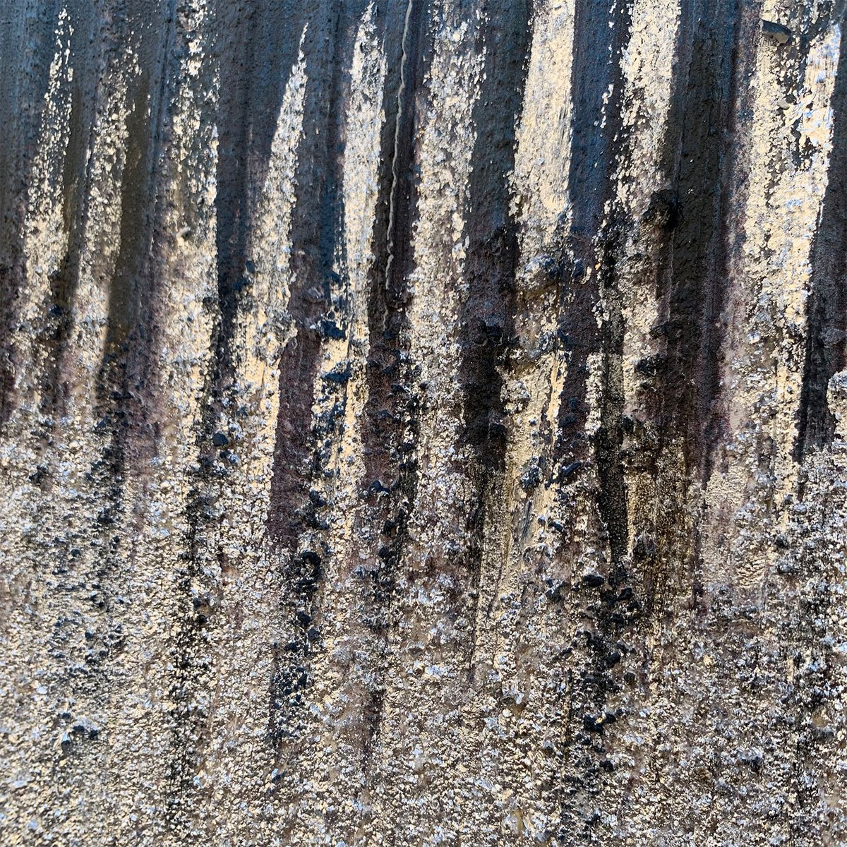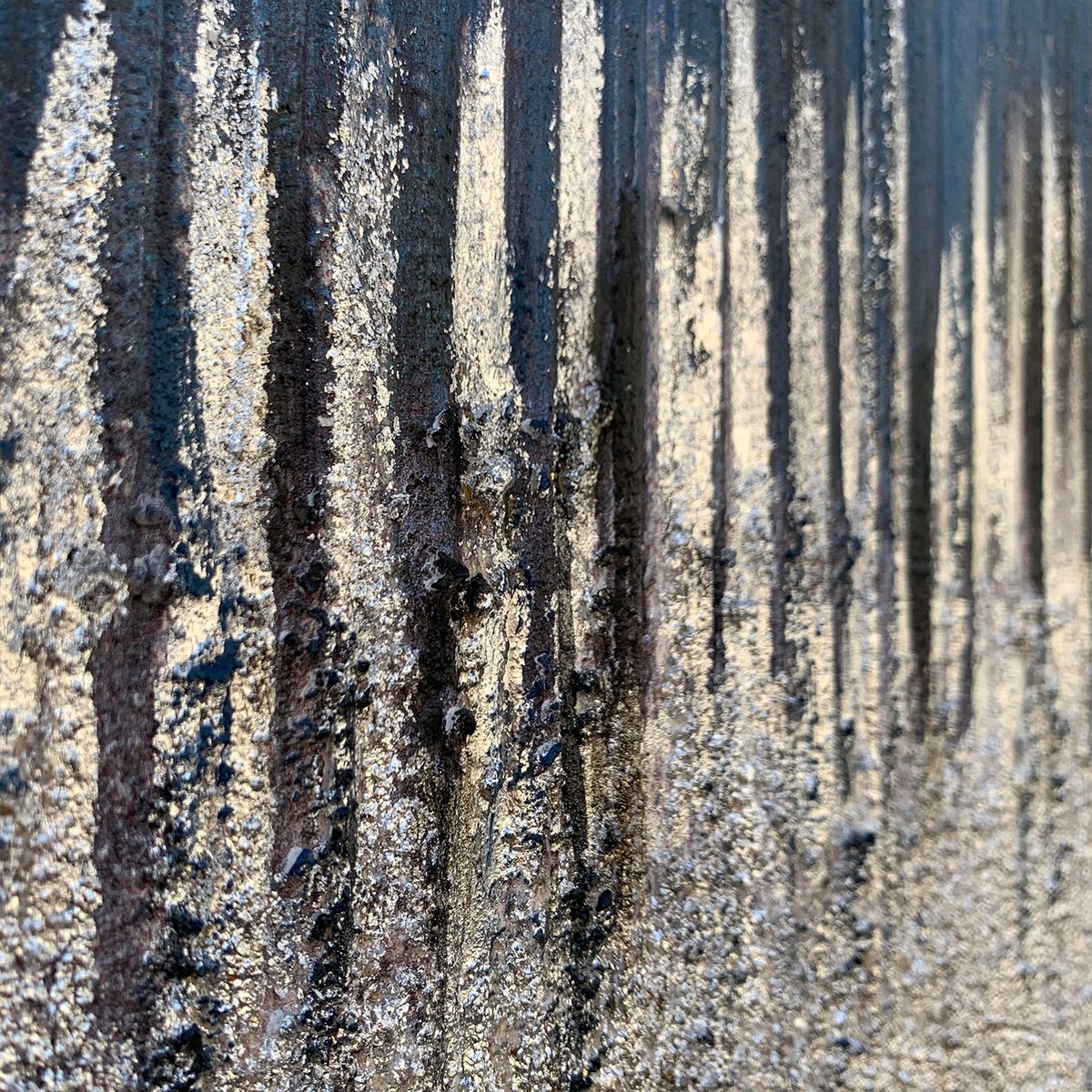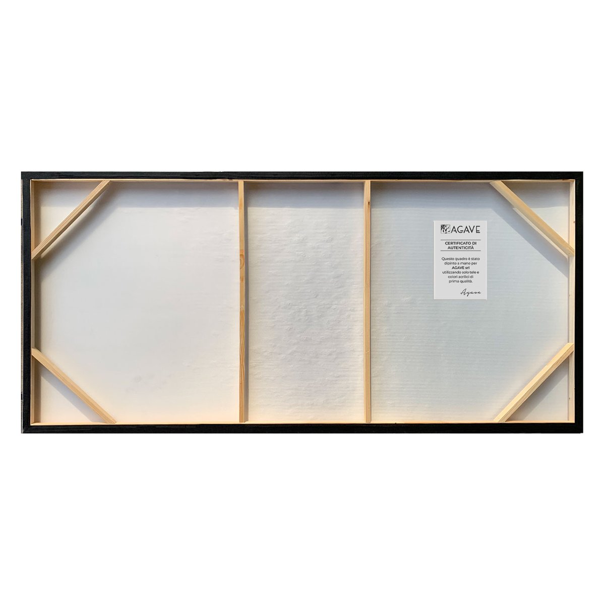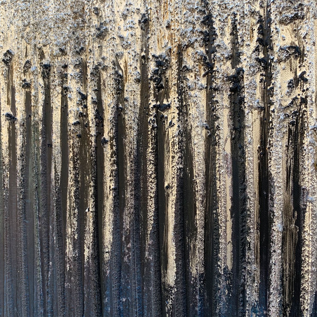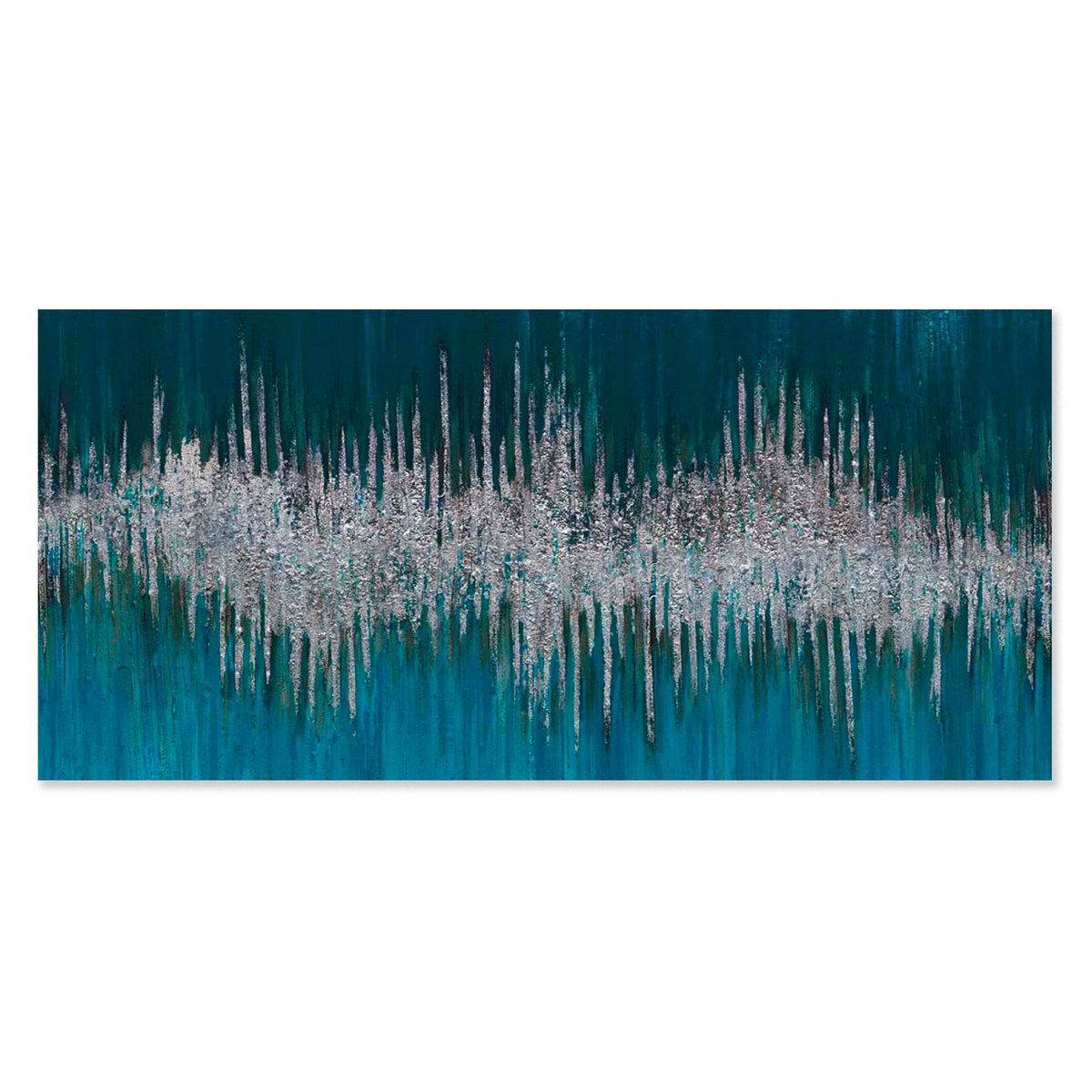 Dark Art es una pintura abstracta pintada a mano sobre lienzo. Dividida en tres secciones distribuidas horizontalmente, presenta un llamativo contraste visual entre el color azul y plata. La notable textura de la pintura añade profundidad a la obra. Con un marco interior de madera y bordes pintados, la pintura está lista para colgar.