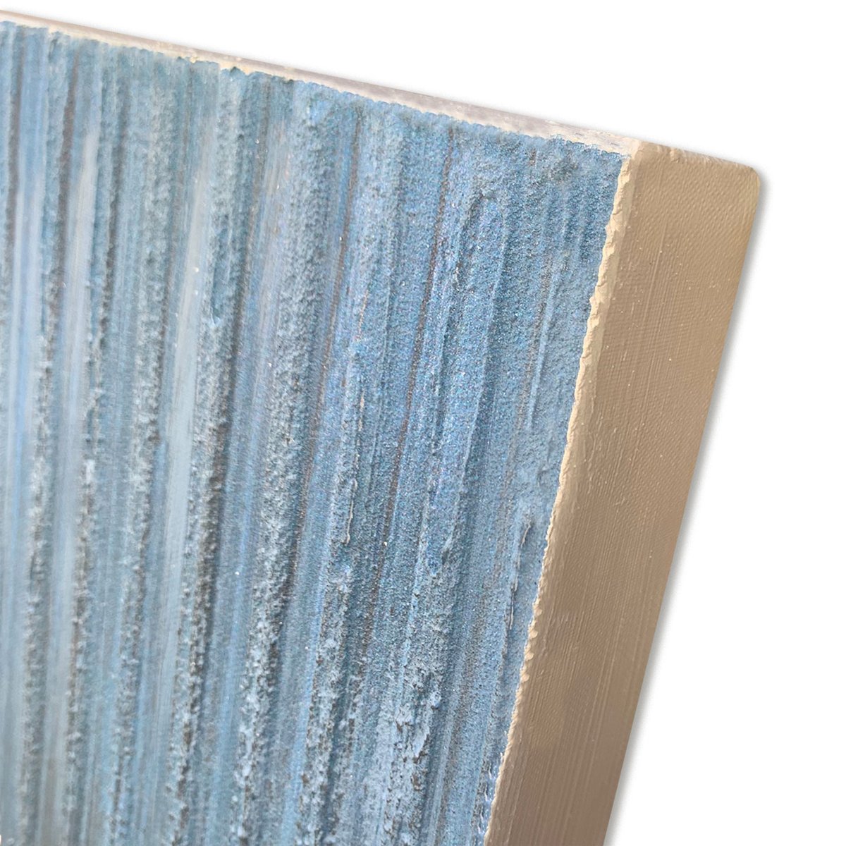 Dark Blue Art es una pintura abstracta pintada a mano sobre lienzo. Dividida en tres secciones distribuidas horizontalmente, presenta un llamativo contraste visual entre el frío color plateado y los profundos tonos azules. La notable materialidad de la obra añade profundidad al trabajo. Con un marco interior de madera y bordes pintados, la pintura está lista para colgar.