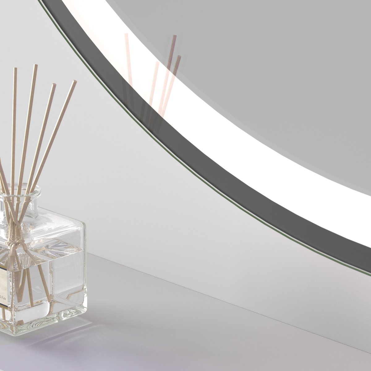 Su iluminación CCT (Temperatura de Color Correlacionada) combina retroiluminación ambiental perimetral con luz frontal emitida a través de vidrio arenado, creando un efecto envolvente que transforma el ambiente con calidez y personalidad. Ideal para baños o espacios que buscan un toque original y sofisticado.